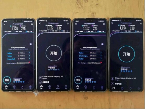 现场采用四个终端测速,使用SA网络时,上/下行速率达到220Mbps和1.1Gbps以上;使用NSA网络时,上/下行速率达到130Mbps和 1.1Gbps以上。同时,高清语音、高清视频、4/5G回落等各项业务均可正常使用。