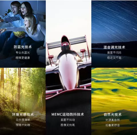 还有防蓝光技术、混合调光技术、环境光感技术、MEMC运动防抖技术、自然光技术这健康画质五部曲,在保证完美画质的同时,也不忘保障用户的健康。