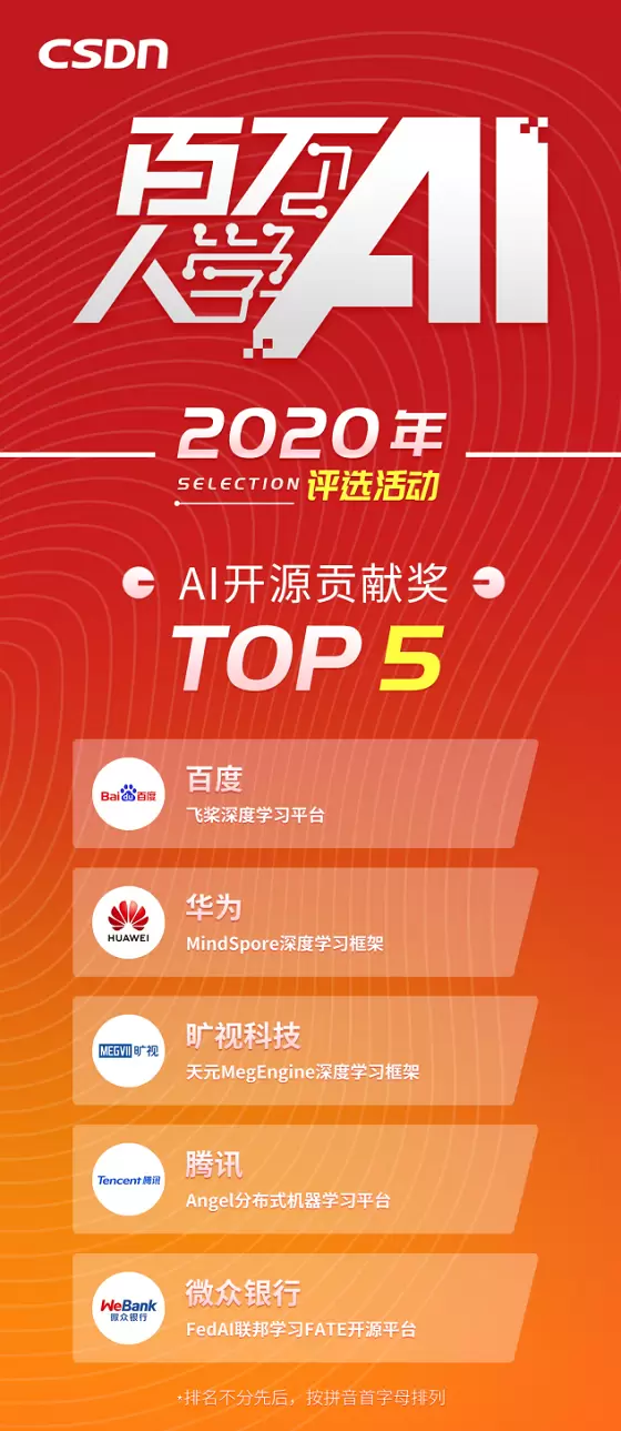 7月3日-4日,由CSDN主办的第三届AI开发者大会(AI ProCon 2020)在线上直播举行。CSDN“百万人学AI”评选活动结果在会上正式揭晓,旷视自研的深度学习框架天元(MegEngine)入选“AI开源贡献奖”TOP5。