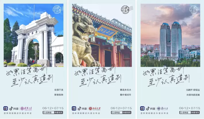 这个毕业季,央视新闻、抖音联合百所高校为毕业生们准备了一场惊喜满满、诚意十足的“云端毕业季”专题活动,让每一个毕业生都能在这个特殊的毕业季不留下遗憾。不仅有医科大学举办的云毕业典礼,北京大学、清华大学、武汉科技大学等高校也都举办了云毕业典礼,让毕业生们可以拥有一次属于自己的高光时刻。同时为了让毕业生们更好的和母校告别,和自己的校园时光告别,抖音还为部分高校定制了创意贴纸,学校大门、绿荫长廊、图书馆、宿舍楼……把这些平时再熟悉不过的地方,变成抖音视频里的贴纸,满足了毕业生们与母校“合影”留念的愿望。
