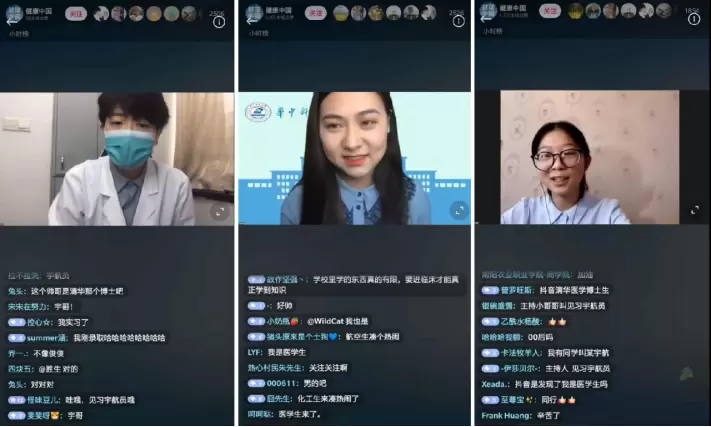 这场云毕业由大家十分熟悉的抖音百万粉丝达人“见习宇航员”担任主持,现在他也是清华大学医学院的一名博士生。直播现场见习宇航员就连线了3位医学院的学生,听他们分享自己在学习过程中的经验与体会,也表达着自己对未来医学生涯的憧憬。