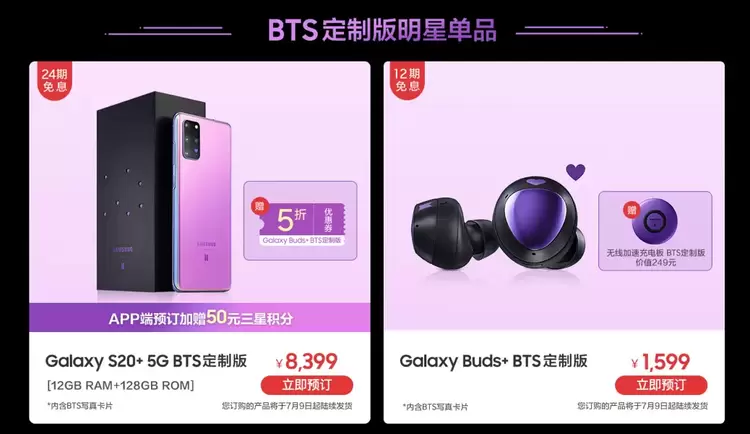 此前,在盖乐世社区的粉丝话题#BTS宠粉套装你认为哪里最吸引你?#的回复中,许多网友和粉丝们都一致认为是外观设计,这款绝美的华丽小王紫色实在太让人“心水”了,更有粉丝指出没有理由不喜欢,要赶紧“拔草”,为哥哥们的人气增添一份力量!想入手的阿米们可以登录三星网上商城等官方线上平台,全款预订自己心仪的三星Galaxy S20+5G|Buds+ BTS定制版,并且还有机会享受至高24期免息分期以及众多惊喜好礼,机会难得,抓紧时间选购吧。