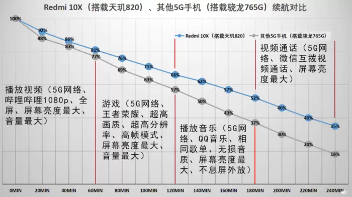 不仅如此,搭载中高端最强5G芯片天玑820的Redmi 10X在续航方面也远远优于骁龙765G的终端。在续航能力的对比测试中,Redmi 10X的电量表现一直领先于骁龙765G终端,经过4个小时的耗电测试,Redmi 10X剩余电量为35%,骁龙765G终端仅剩18%,二者差距相当明显。
