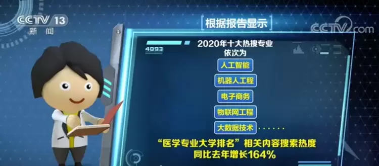 日前,《百度2020年高考搜索大数据报告》公布,报告显示,2020年十大热搜专业为:人工智能、机器人工程、电子商务、物联网工程、大数据技术、网络与新媒体、网络空间安全、软件工程、学前教育、临床医学。其中,“医学专业大学排名”相关内容搜索热度同比去年增长164%。