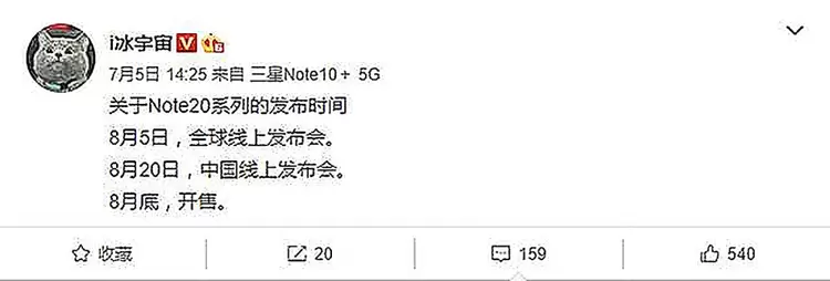 根据市场曝光的信息称,三星Note20系列或于8月5日正式亮相,按照惯例国内时间应该是8月6日凌晨,如果属实,也算提前发布了。