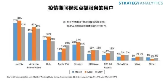 7月7日下午消息,Strategy Analytics最新发布的用户调研报告《COVID-19对SVOD的影响》显示,一旦允许人们自由出行,居家隔离期间订阅视频点播(SVOD)服务的用户激增并不总是持续的。基于在3月,4月和5月对超过4000名美国成年人的全国代表性样本调研,我们发现5月有42%的受访者使用了Netflix,4月为50%,3月为47%。包括Amazon Prime Video,Hulu和Disney+在内的其他服务的用户数量也遵循类似的“疫情高峰”模式。结果表明,3月和4月有大量用户在使用SVOD服务,但随着5月限令的放宽,用户数量再次下降了。但是,这并不适用于所有服务:Apple TV +和CBSAll Access的用户数量在4月和5月均增加了。