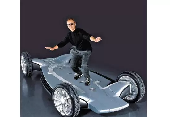 劳伦斯·伯恩斯在 Autonomy 滑板底盘上“冲浪”。这张照片刊登在《汽车工业》杂志 2002 年 2 月号的封面上。(照片由通用汽车公司提供,来自《自动时代:无人驾驶重塑世界》)