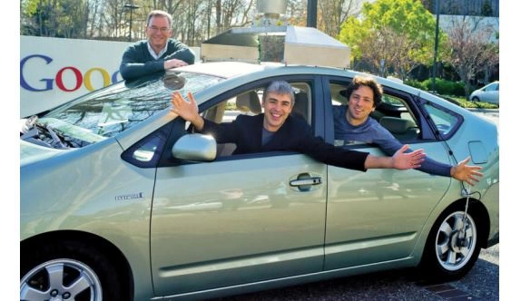 从左到右:埃里克·施密特、拉里·佩奇和谢尔盖·布林体验谷歌的自动驾驶普锐斯。这 3 人于 2009 年招揽了这一领域极为优秀的机器人工程人才,开始了被称为车伕的谷歌自动驾驶项目,从而加快了自主汽车的发展。(照片由慧摩提供,来自《自动时代:无人驾驶重塑世界》)
