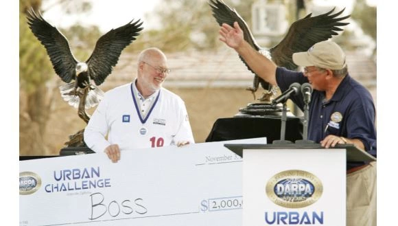 卡内基梅隆大学机器人学教授瑞德·惠特克在接受托尼·特瑟颁发的DARPA城市挑战赛奖杯和200万美元支票时满脸笑容。(照片由卡内基梅隆大学提供,来自《自动时代:无人驾驶重塑世界》)