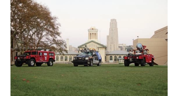2017年10月14日,在卡内基梅隆大学主办的庆祝DARPA城市挑战赛10周年的活动中,展示了Hlghlander、博斯和沙暴。(照片由斯宾塞·斯派克提供,来自《自动时代:无人驾驶重塑世界》)