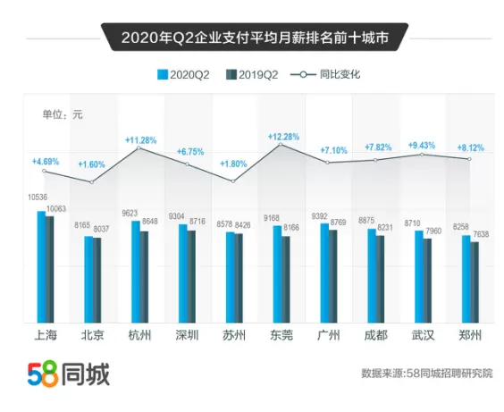58同城招聘研究院《2020二季度人才流动趋势》还对重点城市薪资进行了盘点,其中,上海企业支付薪资依然稳居第一,平均支付月薪10536元,同比增幅4.69%。其次是杭州,平均支付月薪9623元,深圳、广州紧随其后,平均支付月薪也达到9300元以上。在新一线城市中,东莞平均支付月薪9168元,同比上升幅度第一,增幅达到12.28%。今年二季度,东莞发布首个数字产业扶持政策,促进两化融合、5G融合应用、工业互联网发展,传统制造业向“智”造业转型升级,对招聘岗位的技能素质要求进一步提高,因此支付薪资也有所上升。