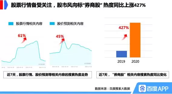 与本轮股票行情的增幅相比,百度搜索大数据反映出的“牛市”热度涨幅更加空前,这从一定程度上体现了疫情后人们对经济复苏和上行的期望。这种期望同样导致了各大板块搜索热度暴涨,网民的关注与搜索热情或将对股票行情产生反作用力。在牛市行情引发的开户潮中,百度为众多新晋散户提供了开户流程、基础知识等必要入门信息和知识,成为他们进入股市的“第一课”。但同时仍需注意:股市有风险,入市需谨慎。