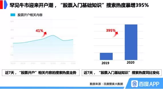 牛市的空前热度也吸引了众多新晋股民,各大券商迎来开户潮,“股票开户”相关内容搜索热度环比上涨41%。股票知识、术语和基础操作方法等信息和知识是新股民的刚需,百度搜索大数据显示,“股票入门基础知识”相关内容搜索同比暴增395%。