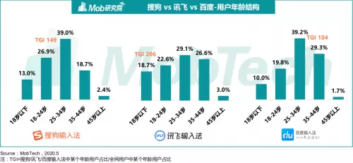 该报告指出,目前三大输入法的用户年龄结构形成了鲜明的分层,并且具备一定的时代特征:百度品牌声名鹊起于世纪初,彼时已是消费主力的75后对国内互联网新生初期的百度已经形成了粘性;搜狗对95年前后的年轻用户有较高的吸引力,TGI为149;而讯飞输入法在18岁以下的年龄群体中TGI则达到了206。