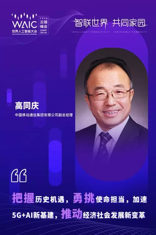 高同庆表示,新基建正当时,5G+AI强引领,中国移动愿意与业界朋友们共创新机遇、共享新成果。中国移动是全球规模最大的5G网络运营商,正致力于实现5G与人工智能、云计算、大数据、边缘计算等新兴科技的深度融合创新,构建创世界一流的“力量大厦”。我们将继续秉持开放共赢的理念,诚邀国内外产业合作伙伴携手奋进,共同“乘5G东风,立AI潮头,上九天揽月”,全力推进5G+AI的融合发展,真正使5G+AI成为实现网络强国、数字中国、智慧社会国家战略的新动能。