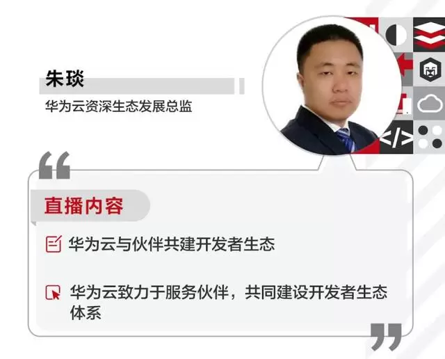 华为云资深生态发展总监朱琰表示,华为云致力于和合作伙伴共同打造开发者生态,已构建了包括伙伴MVP、DevRun开发者沙龙、华为云联盟杯开发者大赛、移动APP扶持-华为终端联动、HC大会在内的生态体系,让开发者能够在生态中更好的成长并获得能力与资源。