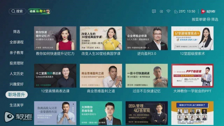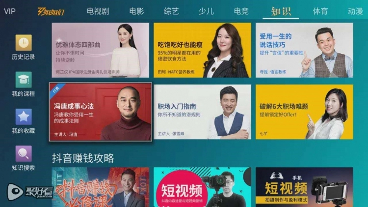 昔日,电视是简单的家庭娱乐工具;如今,电视也可以成为省时高效学习的利器。“VIDAA知识频道”,包含专为年轻人学习充电而定制的内容,其整合了知识付费行业TOP10中的7家优质合作方:新知云、十点课堂、干货帮、吴晓波频道、核桃live、看鉴、前沿讲座,为年轻用户提供涵盖人文历史、女性成长、生活美学、职场晋升、运动健康、亲子教育等优质课程内容,帮助大家提升社会竞争力、缓解知识焦虑。
