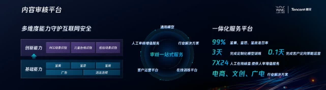 海量数据时代,网络安全形势愈发严峻,同时网络内容安全也具有审核标准差异化、动态化、场景多样化的特点。传统的低效重投入的人工审核方案面临着极大的挑战。通过不断打磨内容审核的基石,优图内容审核平台提供审核一站式服务,鉴黄、鉴恐、鉴证准召率超过99%,通过在线训练平台和客户运营平台,可以3天完成定制化模型训练,2小时完成客户订下策略运营。目前已在电商、文创、广电等多个行业实现落地。