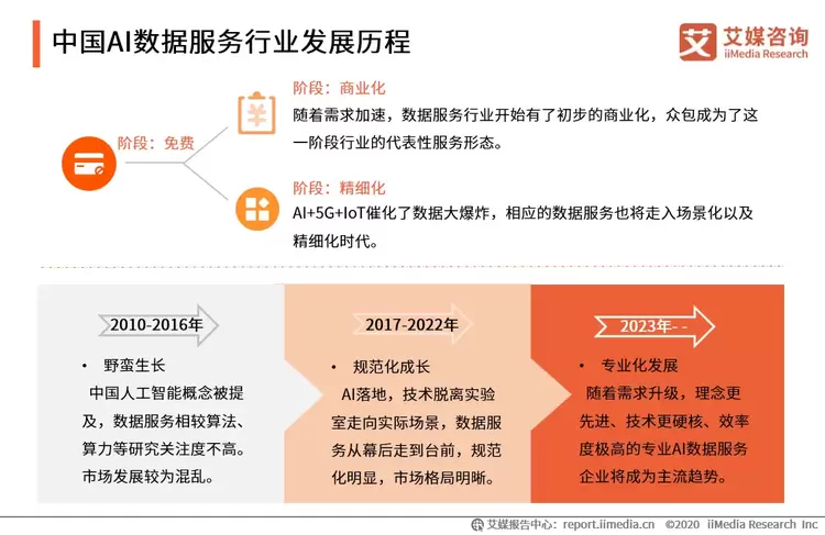 中国AI数据服务行业从2010年的野蛮生长期到现如今的规范化发展阶段,伴随着需求升级,技术更硬核、效率度极高的专业AI数据服务企业将成为主流趋势。