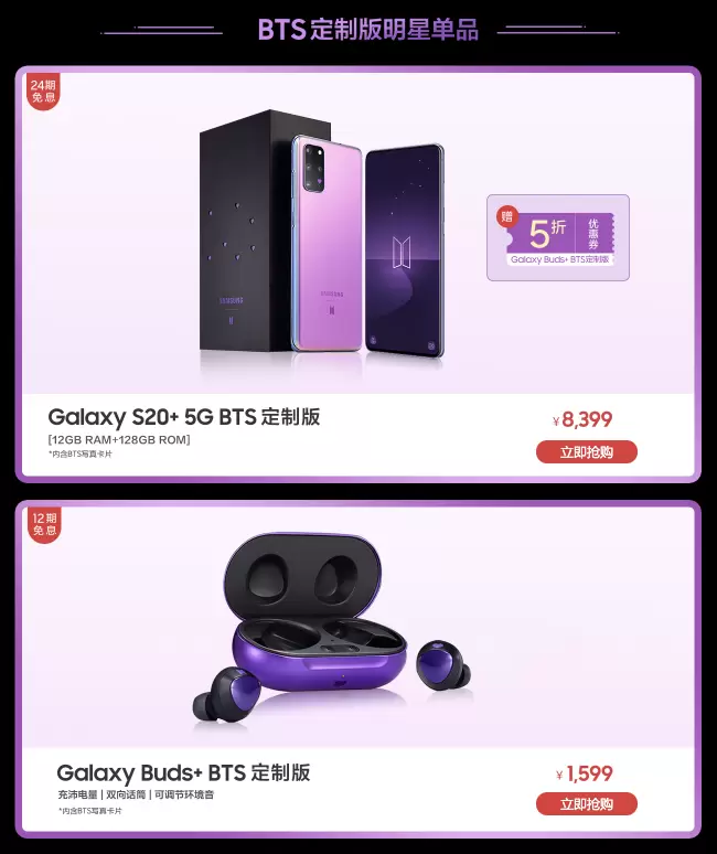 作为一款深度定制的产品,三星Galaxy S20+ 5G|Bud+ BTS定制版无疑为粉丝们带来了足够多的惊喜与幸福,并且也真正意义地诠释了何为定制,更玩出了定制的新高度。目前,三星Galaxy S20+ 5G|Buds+ BTS定制版已在三星网上商城,京东、天猫、苏宁三星手机官方旗舰店以及线下门店火热售卖中,粉丝们可以登录线上渠道下单,或前往线下门店体验购买。其中购买三星Galaxy S20+ 5G BTS定制版不仅可以享受至高24期免息分期,还可以获赠购买Galaxy Buds+ BTS定制版的5折优惠券;而直接购买三星Galaxy Buds+ BTS定制版的粉丝则可以享受至高12期的免息分期,所以心动的阿米们还等什么,快来拔草,沉浸在这份来自Idol的宠爱中吧。