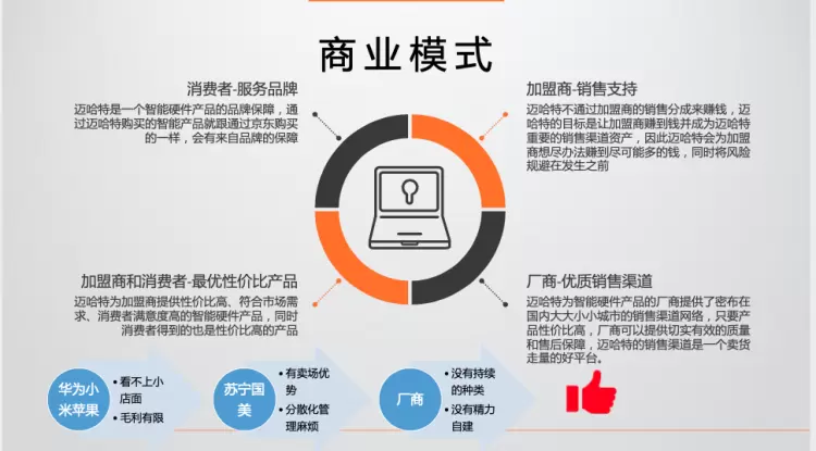 北京迈哈特将通过品牌授权、投资商系统支持以及可靠有效的采购等方式建立起一整套完善的面向c端客户的智能硬件产品销售和服务体系。通过这套体系,迈哈特将绕开来自苹果、华为和小米等已有以手机销售直营店为代表的品牌专卖店的挑战,同时又可以将国美、大中电器等传统的店面销售模式的优势得以传承和发扬。