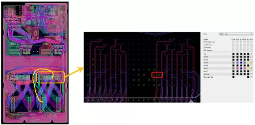 通过前期的仿真分析,浪潮选定背扣式,即方案二作为了设计方案。为了保持信号传输路径最短,满足插损要求,信号线的布线路径不能如下图左侧黄线路径设计,必须从连接器内部穿过。而这会导致25Gbps信号穿过25Gbps信号过孔(红圈)之间发生串扰。浪潮工程师通过合理的布线层设计及创新性使用背钻技术,改变过孔的长度,规避了线到孔的信号串扰。