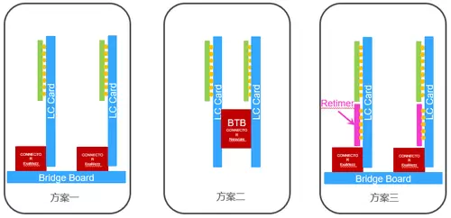 受物理空间限制,一块LC板上只能放置2个AI芯片模组,如何在这样的槽位内实现4个AI模组是达成该产品规格的关键问题。针对该问题,浪潮提出桥接,对扣,Retimer三种解决方案。由于芯片放置于AI模组上,模组同PCB连接时本身需要一对连接器,无论哪种方案都会涉及到AI芯片的25Gbps多次跨越连接器的问题。依据芯片厂家规范,4颗芯片无法多次跨越连接器,也就无法分布在两块单板上。但客户需求是最强的AI算力,若不能实现单槽位4个AI芯片互联,服务器计算能力也会下降,无法满足客户需求。那就只剩一个选择,突破厂家规范,解决25Gbps多次跨连接器的信号完整性问题,实现4颗芯片分布在2个板上互连。