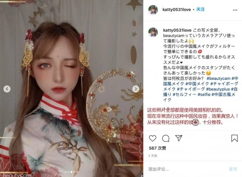 日本美妆博主@katty0531love表示“现在非常流行这种中国风妆容,效果太棒了,从来没有化过这样的妆容,十分推荐!”