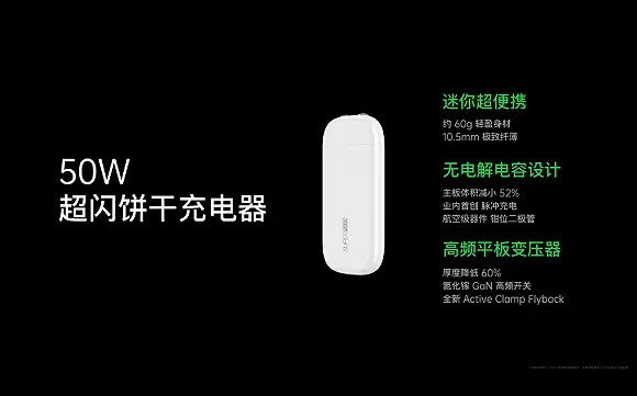 50W 超闪饼干充电器首创跑道式超薄外形,其厚度仅 10.5mm ,配合折叠插脚设计,可轻松放置于衬衫、牛仔裤口袋,超小无负担。50W 超闪饼干充电器兼容 SuperVOOC和VOOC 闪充,支持 27W PD 、18W QC和 50W PPS 等行业通用快充协议,可为手机、平板电脑电脑等设备进行快充。