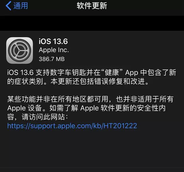 此次iOS 13.6 支持数字车钥匙并在“健康” App 中包含了新的症状类别。本更新还包括错误修复和改进。