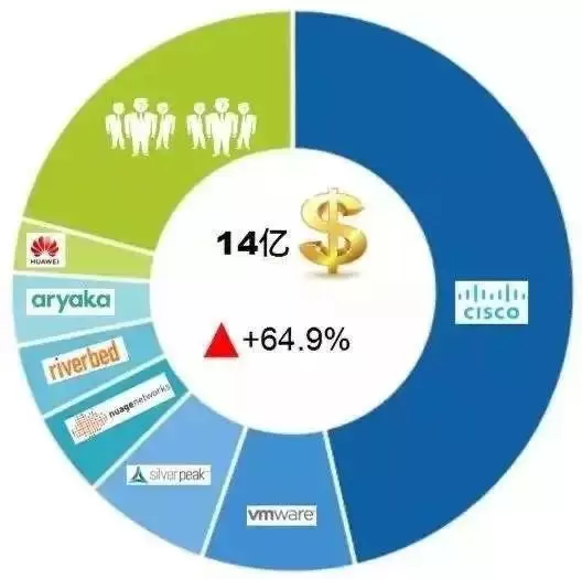 2017年,VMware 完成对VeloCloud的收购后, 将网络虚拟化从传统的数据中心进一步拓展到了广域网,并迅速登上了市场份额第二名的位置,甚至受这个收购案的影响,2018年还曾有过VMvare短暂超过思科的情况。