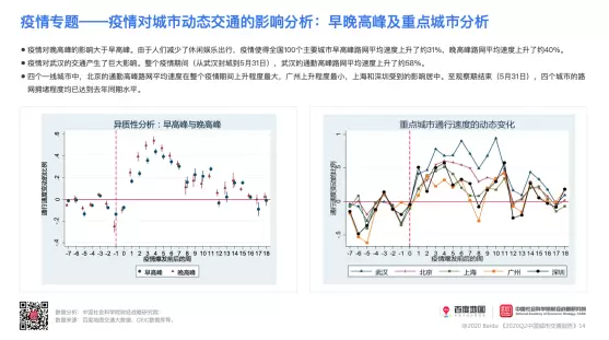 与此同时,《报告》还从城市异质性、早晚高峰、重点城市三个方面进一步分析,得出以下结论:疫情对确诊病例更多、人口规模更大的城市交通出行影响更大;由于人们减少了休闲娱乐出行,疫情对晚高峰的影响大于早高峰。重点城市的观察数据则可部分佐证以上结论,疫情对武汉的交通影响巨大,武汉的通勤高峰路网平均速度在整个疫情期间(从武汉封城到5月31日)上升了约58%;而在四个一线城市中,北京的通勤高峰路网平均速度在整个疫情期间上升程度最大,广州上升程度最小。