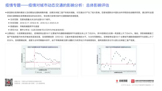 为揭示新冠肺炎疫情对城市交通拥堵的影响程度,百度地图联合中国社会科学院财经战略研究院,对全国百城交通拥堵情况在疫情爆发前后的动态变化进行了系统研究。研究结果表明,疫情使得全国100座主要城市的早晚高峰路网平均速度较疫情前总体上升约29%,较去年同期上升约35%。随着复工复产和复商复市的有序推进,疫情对城市通勤高峰路网平均速度的影响逐渐回落,通勤高峰路网平均速度至5月31日基本恢复到疫情前水平,且与去年同期基本持平。可见,疫情的爆发抑制了人们的出行需求。