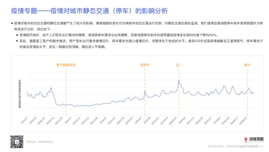 疫情对城市交通的影响,不仅体现在动态出行层面,还体现在静态停车层面。《报告》显示,疫情初期百度地图停车助手使用量较疫情发生前的均值下降约60%,用户停车需求骤降。其后随着疫情缓解及复工复产的推进,用户停车需求缓慢回升,直到4⽉份清明节才恢复至疫情前水平,并在五一假期达到顶峰后进入平稳期。