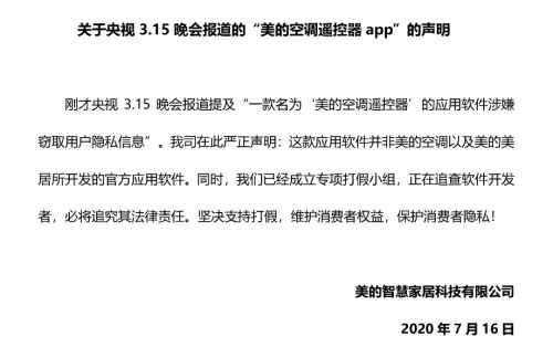 7月16日晚央视3.15晚会上曝光多款手机应用软件涉嫌通过“窃贼插件”窃取用户隐私,其中一款名为“美的空调遥控器”的应用软件位列其中。美的集团官方渠道当晚立即回应称:这款应用软件非美的空调和美的美居所开发的官方应用软件,并已成立专项打假小组,追究其法律责任。