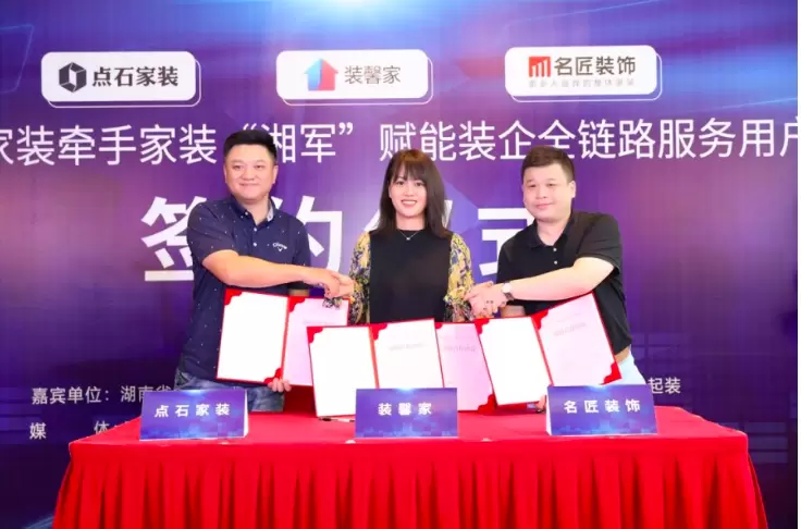 活动现场,湖南省室内装饰协会会长李金龙、百度房产家装垂直行业总经理&装馨家平台总经理安欢、点石家装总裁欧煜、名匠装饰总裁颜鋆等出席签约仪式。