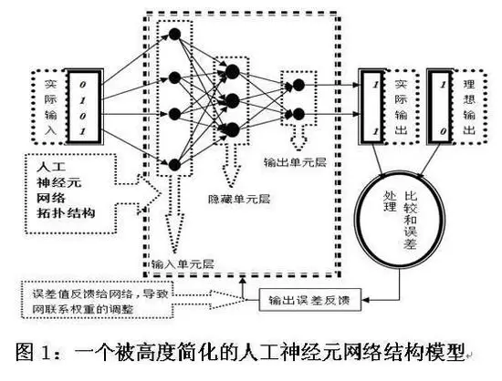 该技术的实质,是用数学建模的办法建造出一个简易的人工神经元网络结构,而一个典型的此类结构一般包括三层:输入单元层、中间单元层与输出单元层。输入单元层从外界获得信息之后,根据每个单元内置的汇聚算法与激发函数,“决定”是否要向中间单元层发送进一步的数据信息,其过程正如人类神经元在接收别的神经元送来的电脉冲之后,能根据自身细胞核内电势位的变化来“决定”是否要向另外的神经元递送电脉冲。