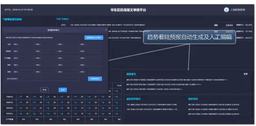 眼控科技智能集中预报指导系统是针对机场报文编发研发的智能化产品,通过智能数据模块解析,自动解析数值模式数据、机场天气实况数据、自动观测数据、历史天气气候数据等多种气象数据,生成丰富的预报指导产品,并根据民航局报文规范,自动生成机场预报(TAF)、趋势着陆预报等气象报文,生成的报文只需经过预报员复核即可发布,免除了需要人工编辑报文的过程,实现了报文编译的自动化,极大提升了报文编辑效率。
