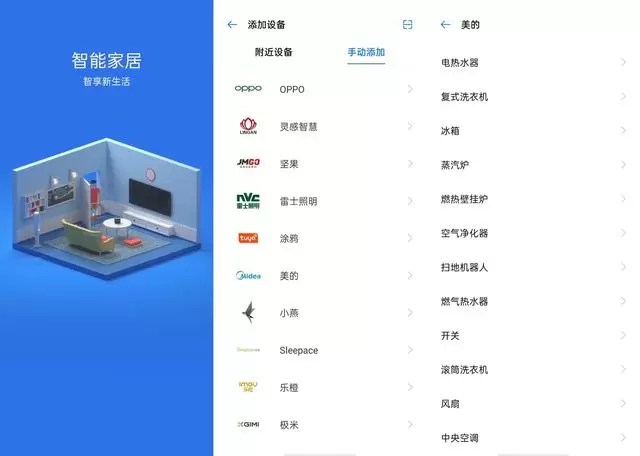 当然,不止官方产品。越来越多的三方合作企业产品也已经接入OPPO的IoT系统。打开ColorOS 7.2的智能家居APP,可以看到熟悉的长虹、美的、极米、小天才、奥克斯、欧瑞博等一系列产品。