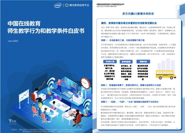 7月15日,英特尔携手腾讯共同发布2020年首份《中国在线教育师生教学行为和教学条件研究报告》(以下简称“《报告》”),重点关注此次疫情背景下,在线教育需求的井喷态势,以及教师、家长、学生的痛点,从3900个调查样本中分析国内小学及初高中(后文简称“K12”)在线教育师生的教学行为、教学条件、教学效果出发,报告认为适当的教学终端产品至关重要,以科技赋能将开辟K12在线教育的宽阔新赛道。