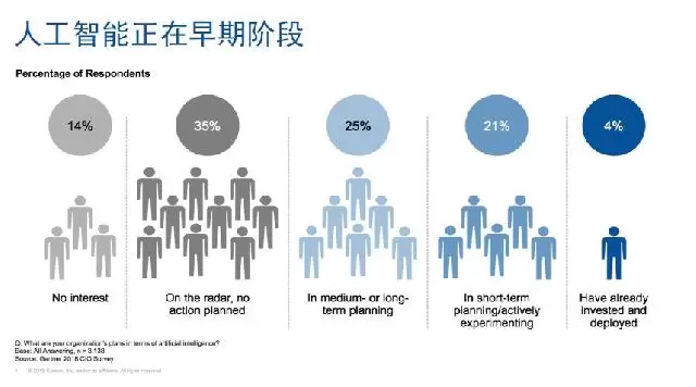 在Gartner最近所做的一次问卷调查中,不同行业的3000多家公司大约有50%已经把AI列入了他们未来的产品和管理计划当中,但是只有大约4%的公司能够真正地运用AI技术……