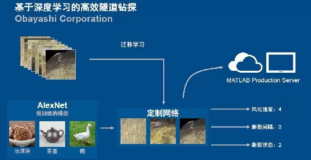 如果数据不足,能做人工智能吗?这是很多初创公司的困惑。“迁移学习可能会是一个不错的选择。”在赵志宏所列举的高效隧道钻探案例中,日本科学家利用已有的AlexNet网络,将手边仅有的1000余张经过标记的隧道表面地质状况照片进行定制性训练,使得新网络能够识别地质参数,识别精度也达到了90%以上。然后,将开发好的算法利用MATLAB Production Server部署到云端,这样,钻井工程师、探测工程师就可以通过使用IPAD随时随地对隧道的表面照片进行探测,从而大大地提高了挖掘效率。