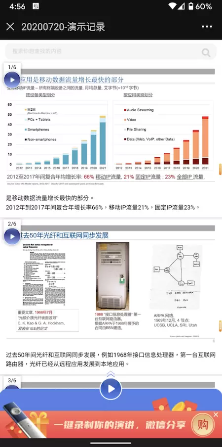 听众只需要通过手机扫描屏幕上的二维码即可获得全套资料。通过测试不难发现,科大讯飞智能演示器可以迅速的将演说内容转化为文字,并与PPT内容进行结合。同时还可回放每页PPT的演讲语音。这样,与会者可以全身灌注的听,演讲者也可以尽情去表达。
