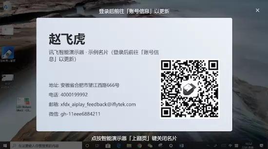 每次演讲结束后,也往往少不了名片交换的环节,演讲者同样可以对科大讯飞智能演示器说“打开我的名片”,即可在屏幕中显示出预设好的个人名片,方便与听众日后的进一步沟通。
