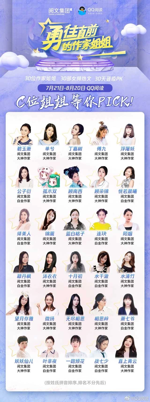 7月21日,由阅文集团旗下QQ阅读举办的“勇往直前的作家姐姐”活动正式启动。三十位来自阅文集团的重量级作家姐姐将带着她们的作品而来,经过书粉的投票助力,最终将有5位作家晋级胜出。