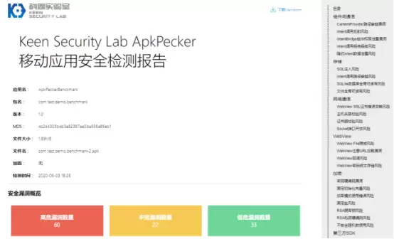 通过一系列高效、完备、准确的漏洞检测流程,ApkPeckerP已经具备了控制管理和APP漏洞自动挖掘能力,能够实现程序源文件、内部数据交互、APP防御、第三方SDK等多维度的漏洞检测。