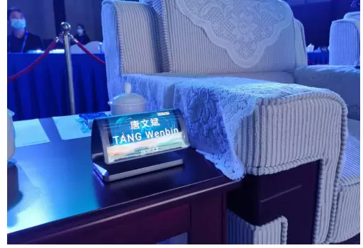 虽然看起来只是一块小巧的柔性曲面屏幕,但RoMeeting纤薄的身躯内蕴藏着柔性显示与柔传感以及智慧物联技术的“乾坤”。它搭载了柔宇自主研发的全柔性屏,分辨率达到1920*1440,作为一块电子铭牌,能够清晰呈现参会嘉宾、会议流程等信息,且可以如智能手机一样触控。