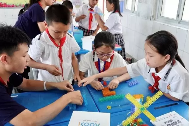 南昌大学志愿者与井冈山小学学生一起搭建KOOV模块
