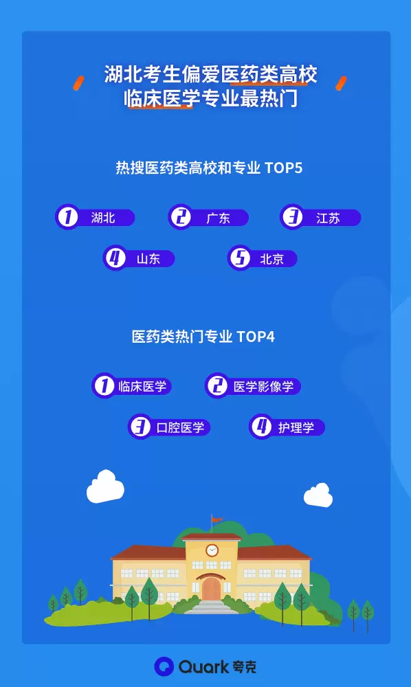 全国民众见证了湖北人的坚强与乐观,医护人员代表的“逆行者”成为人人瞩目的英雄。夸克数据显示,全国热搜医药类高校、专业地区中,湖北考生居首,临床医学、医学影像学最受追捧。