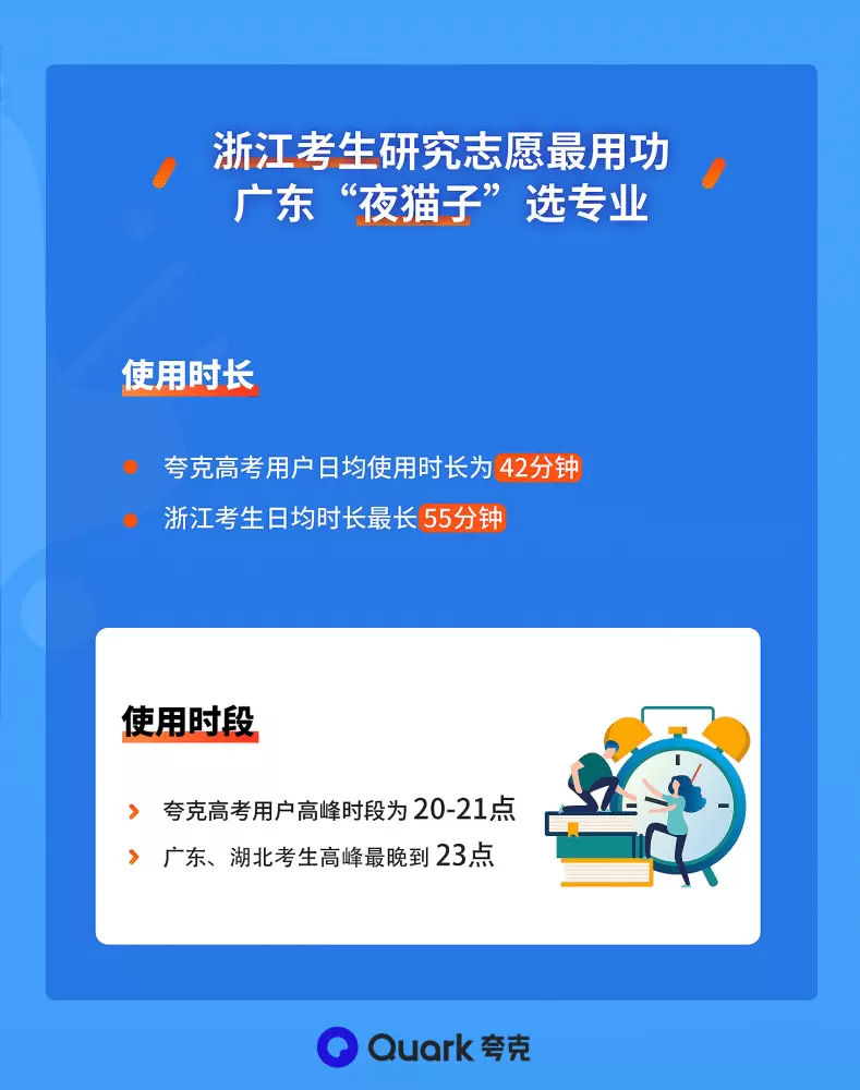 其中,高校与专业查询、AI录取预测、性格测试等提升了人生抉择的效率和质量,成为莘莘学子标配的AI“智囊团”。夸克搜索数据显示,用户日均使用时长达42分钟,浙江考生钻研志愿最用功,广东、湖北考生是名副其实的“夜猫子”,23点查选专业正忙。